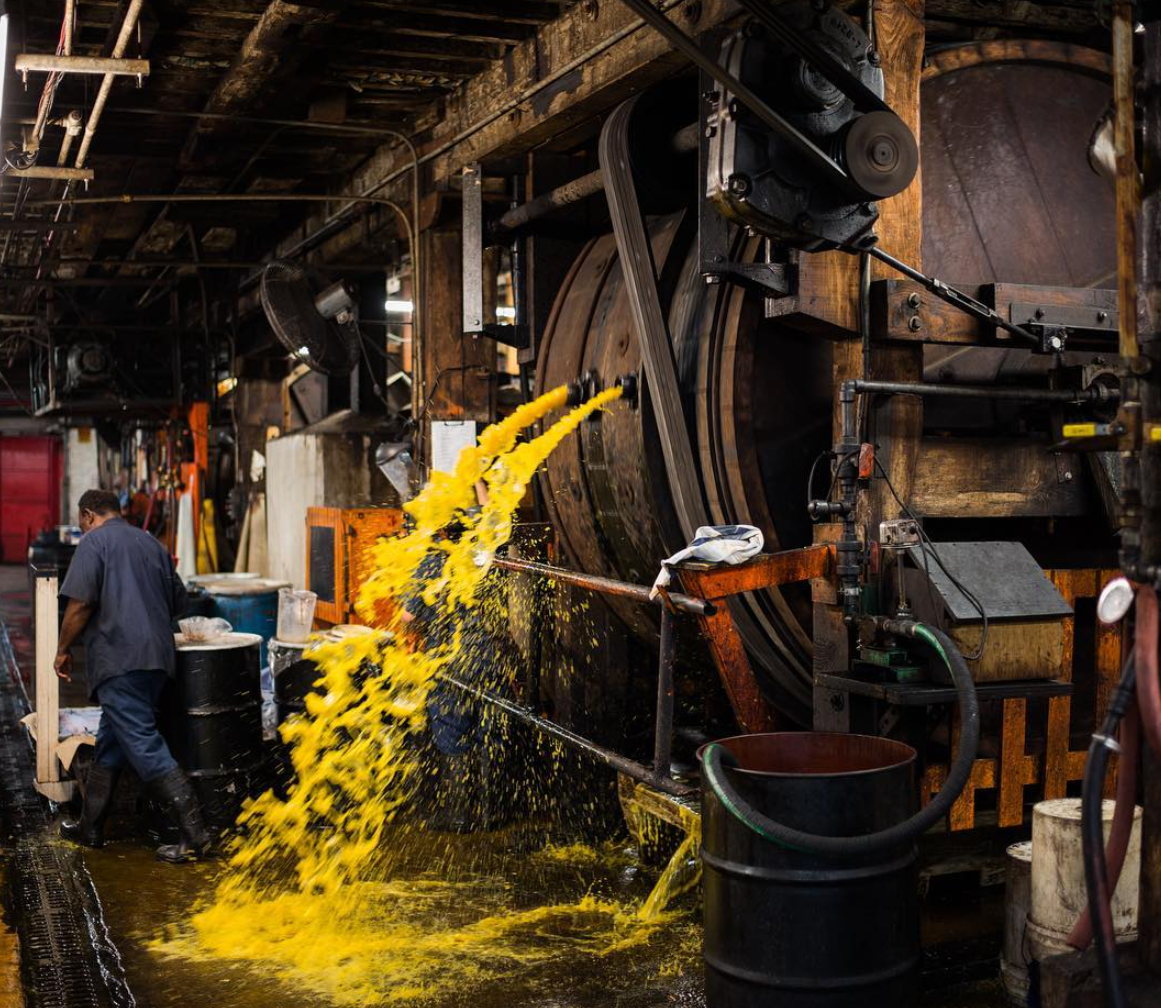 The hides are then moved into a fleshing machine, where rotating spiral blades remove excess tissue from the hide. This is also where collagen is extracted for sale to the cosmetics and other industries.
